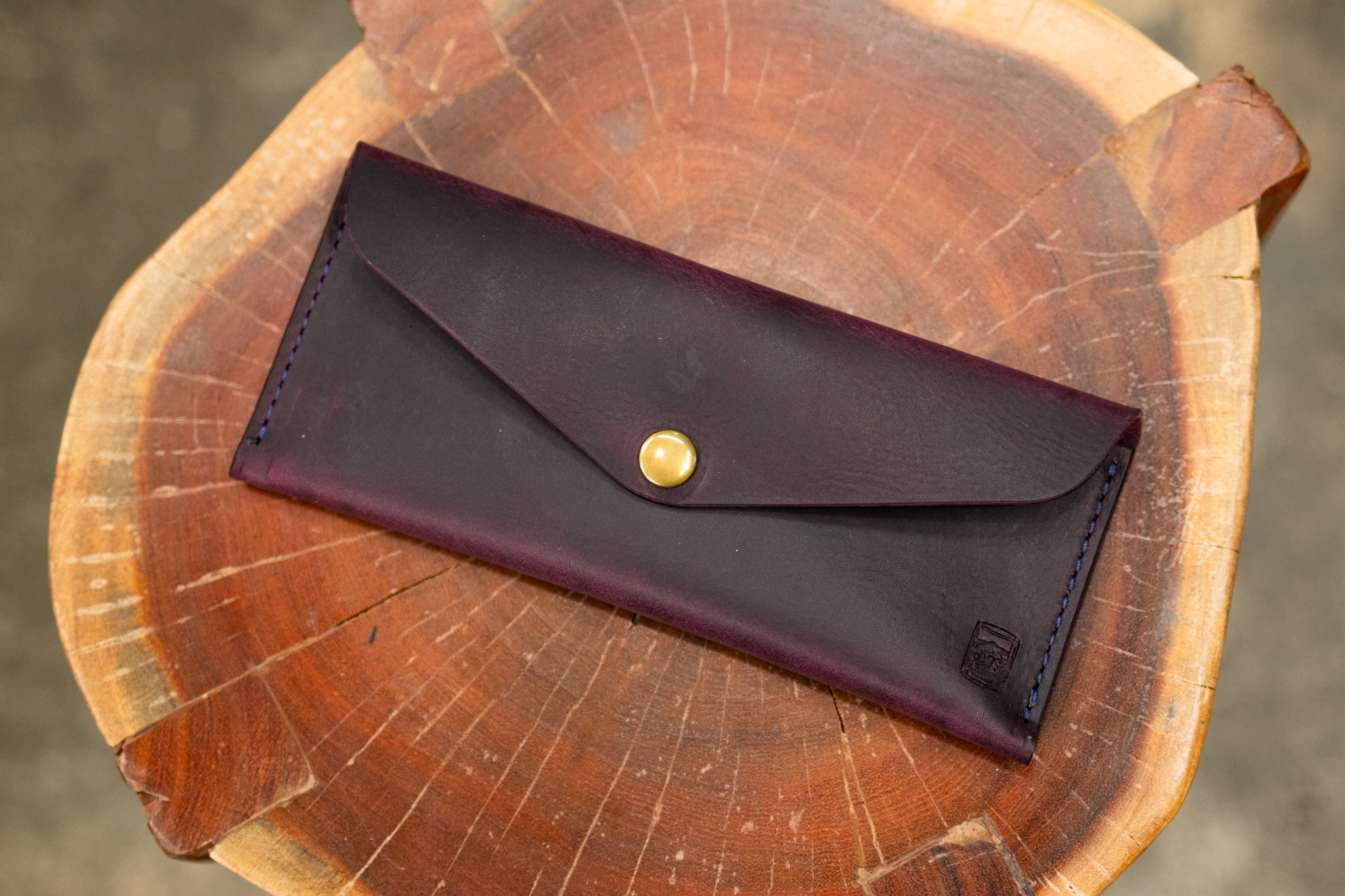 Handcrafted full-grain Leather Money Envelope with Antique Brass snap closure. Made from premium full-grain leather and your favorite thread color, this envelope holds over 100 bills and snaps shut to keep it secure. Great for business owners taking cash transactions at markets, home owners looking to keep a rainy day fund, or just to have easy cash on hand in your car or bag.