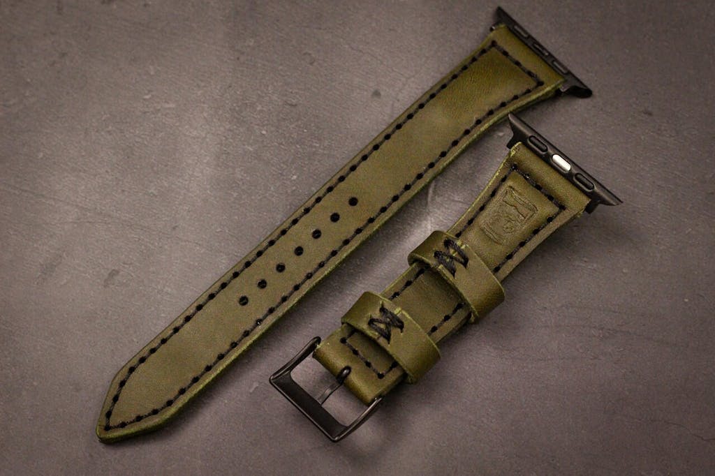 The Classic Leather Apple Watch Band is made from Olive Green Minerva imported Italian leather that will age absolutely beautifuly over time. The Minerva leather is a smooth, full-grain leather that gets richer, darker and even develops a slight sheen as it patinas.
