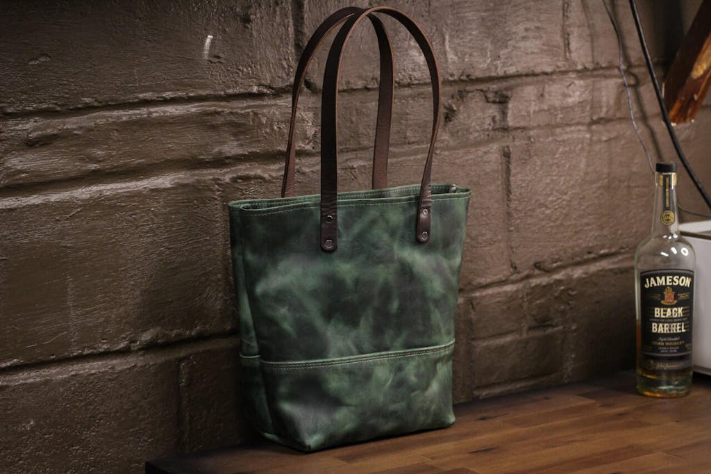 The Double Panel Tote Bag is the perfect everyday tote to carry all of the essentials in a super unique way. Made from Evergreen pull-up leather, this tote leaves beautiful light streaks when the leather creases that come and go making it truly one-of-a-kind. Dark Brown handles compliment the dark brown double stitching. Inside you'll find a convenient carry pocket for your phone and other accessories you want to find easily. The opposite interior side has a d-ring to quicky snap your key ring on and off. All hardware is Gunmetal Nickle, including rivets reinforcing all stress points.
