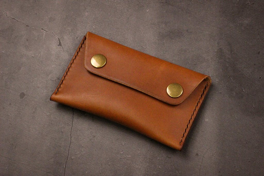 This leather snap card holder is the perfect way to your busines cards, or even coins and cards in style. It fits around 10 +/- business cards inside a full-grain leather pouch that snaps shut and is hand stitched for strength.